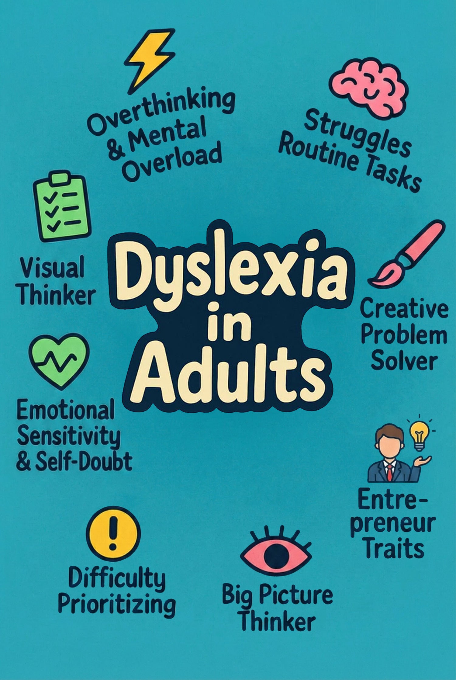 Dyslexia isn’t just about struggling to read as a kid. Dyslexia in adults, can show up in ways you might not expect—like getting overwhelmed with written instructions, mixing up details, or even avoiding tasks that feel “simple” for others. It’s more about how we process and perceive information than about intelligence (which we have plenty of, by the way).